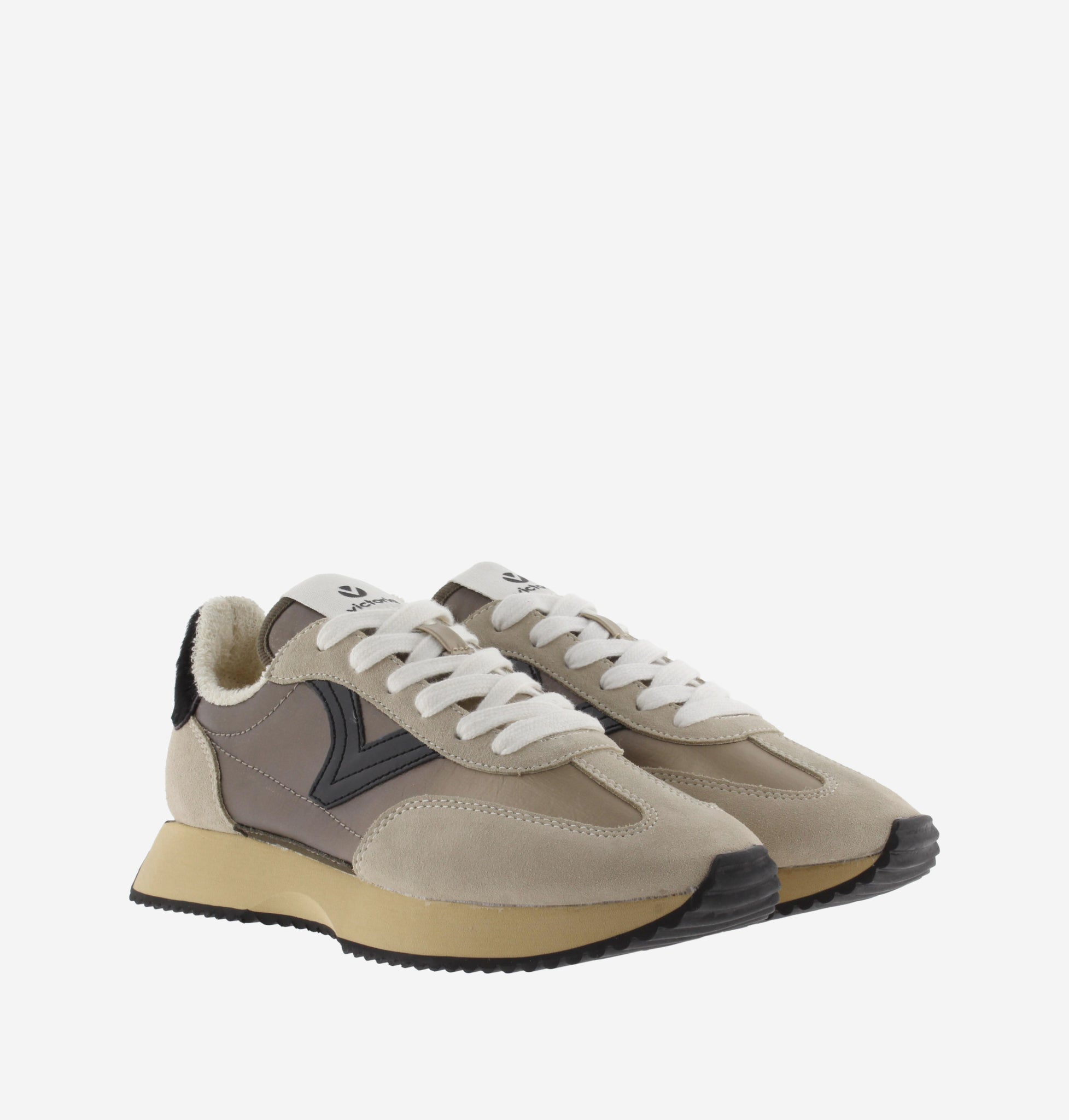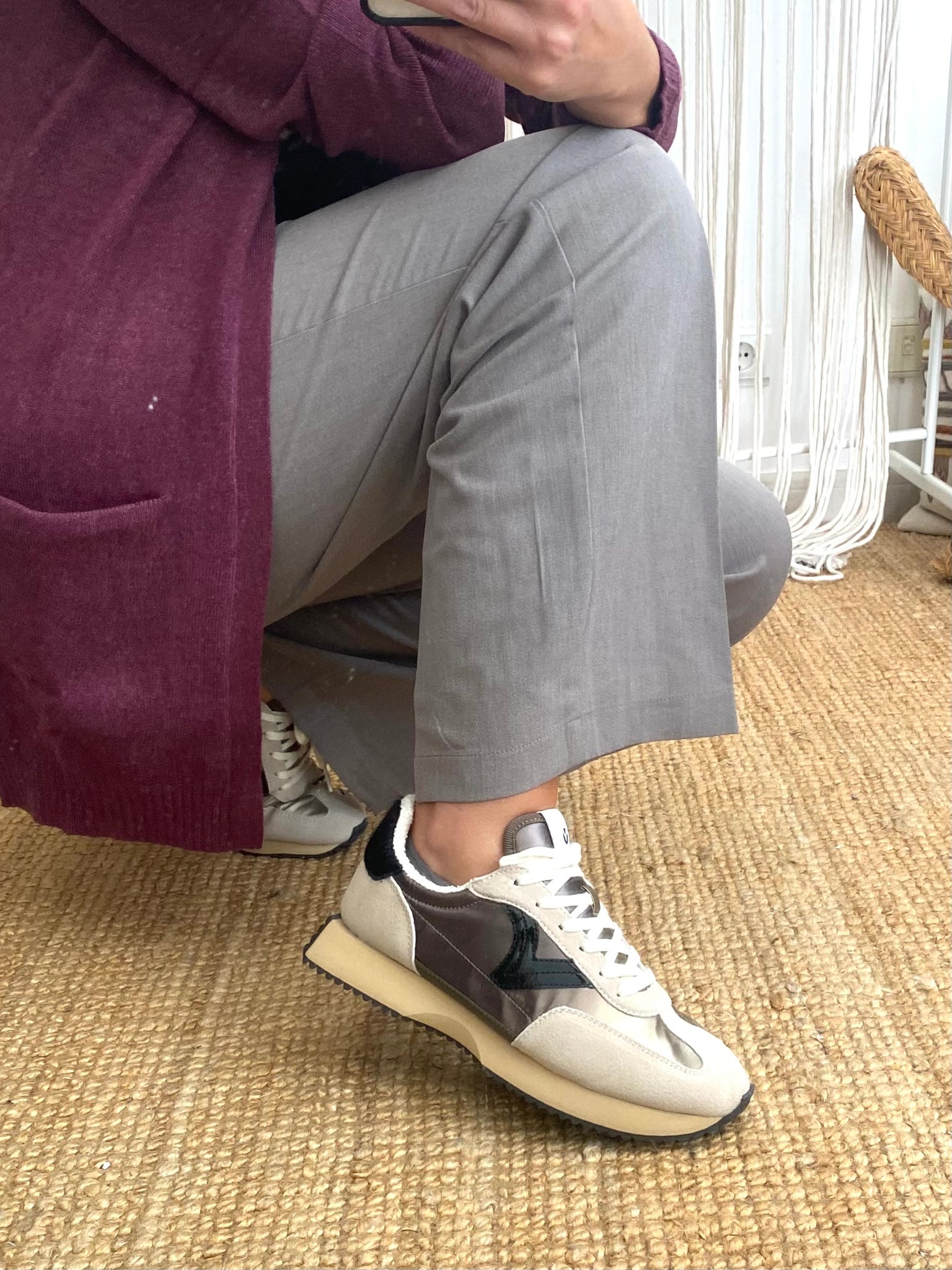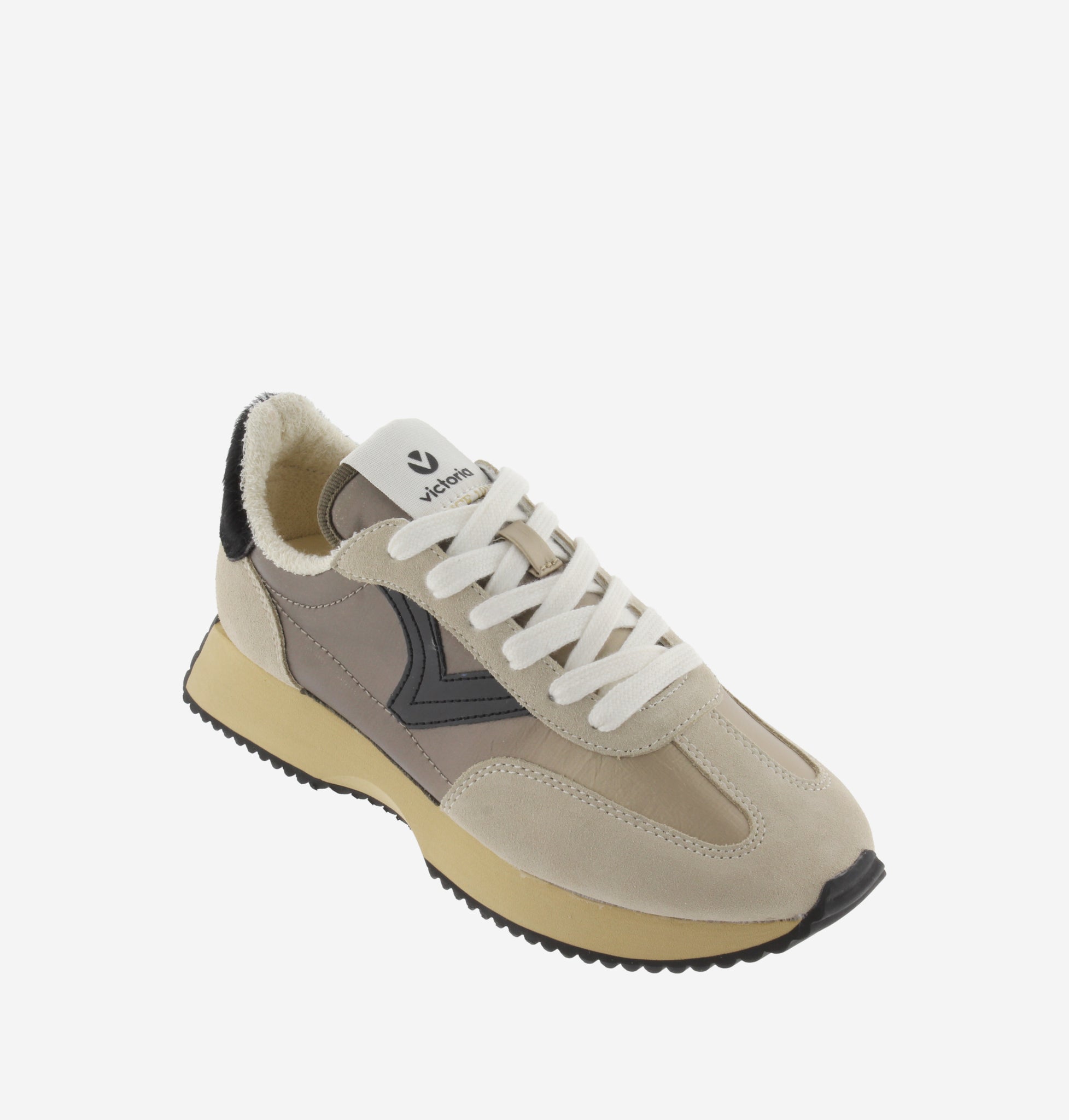 Sapatillas de nylon metalizado com combinação de camurça e nylon. Interior tecido turco. Detalhe animal print na parte de trás.