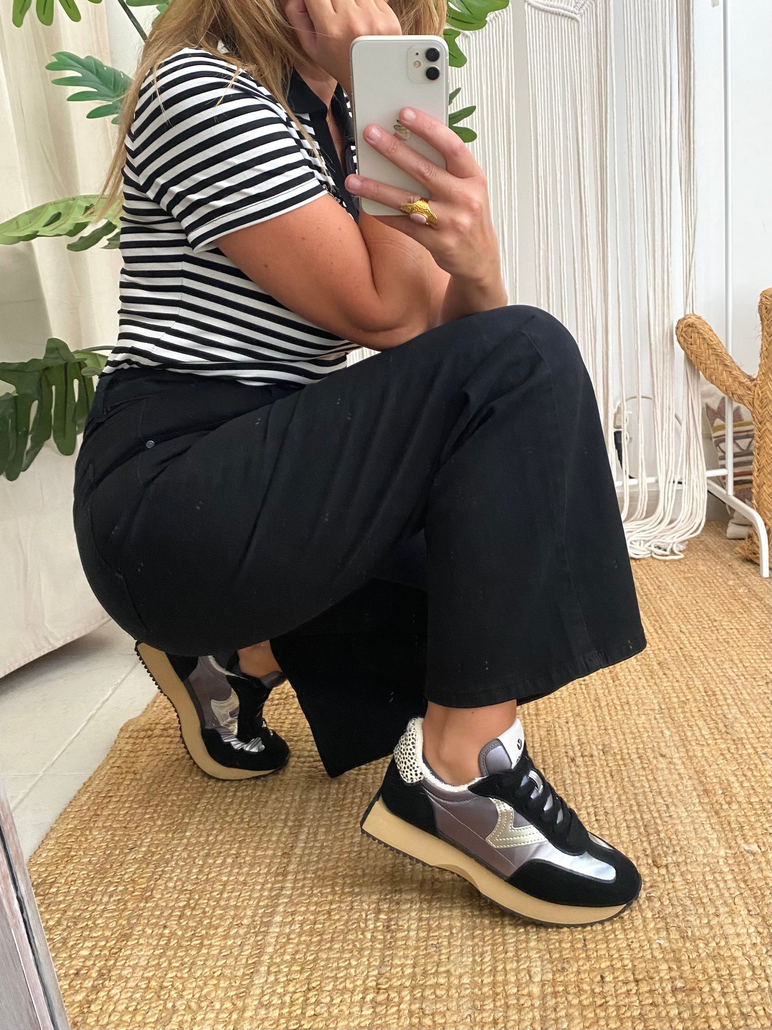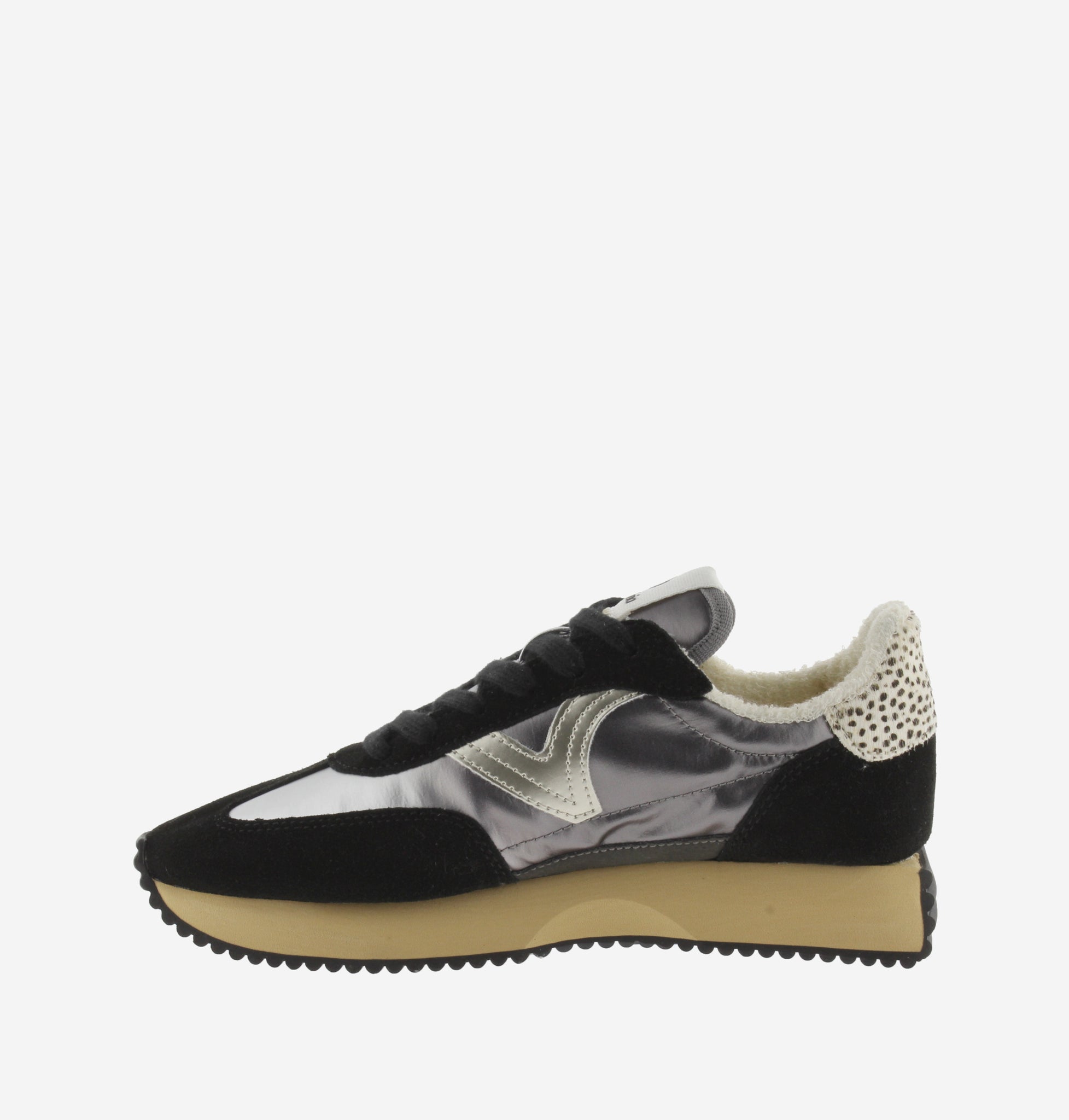 Sapatillas de nylon metalizado com combinação de camurça e nylon. Interior tecido turco. Detalhe animal print na parte de trás.