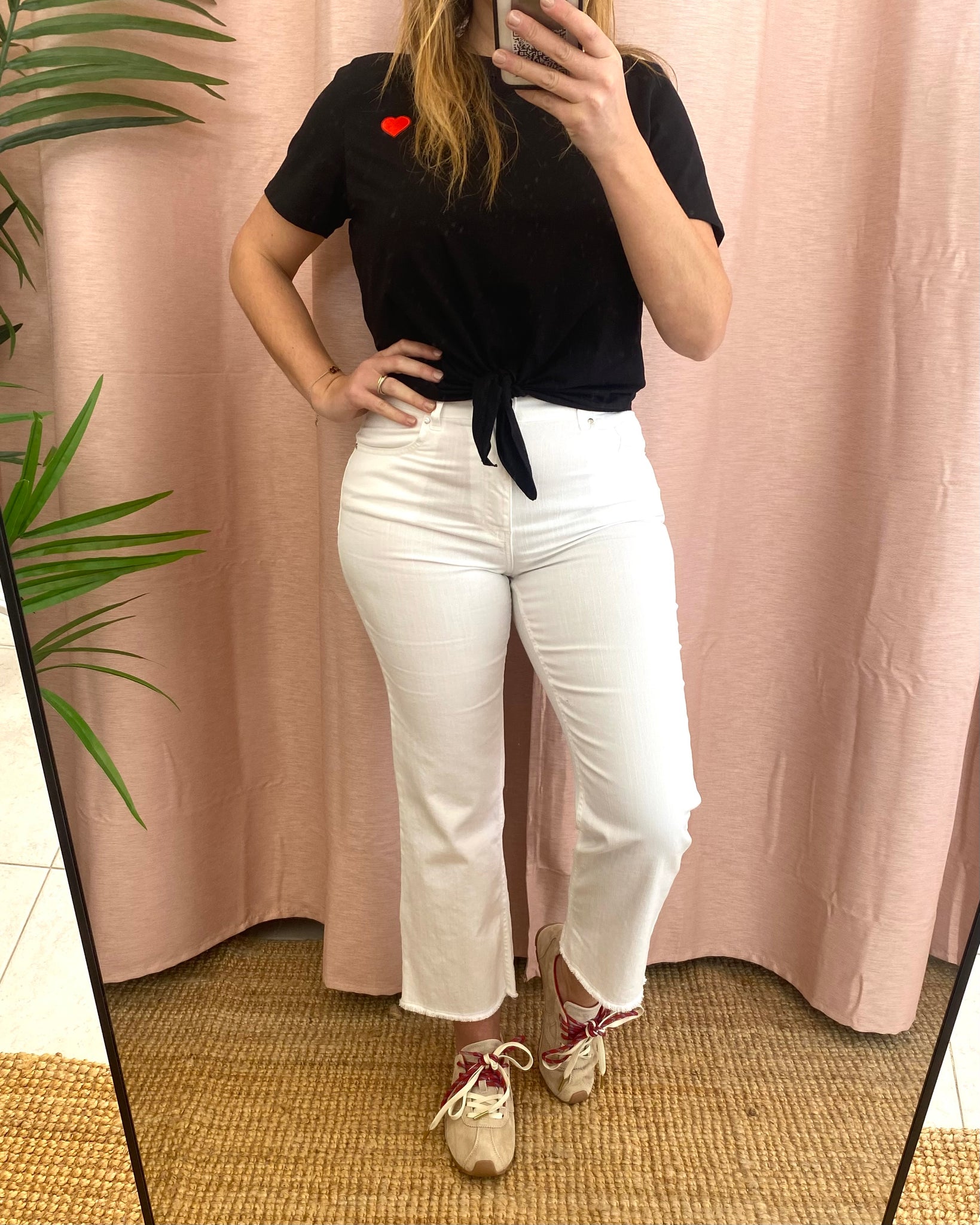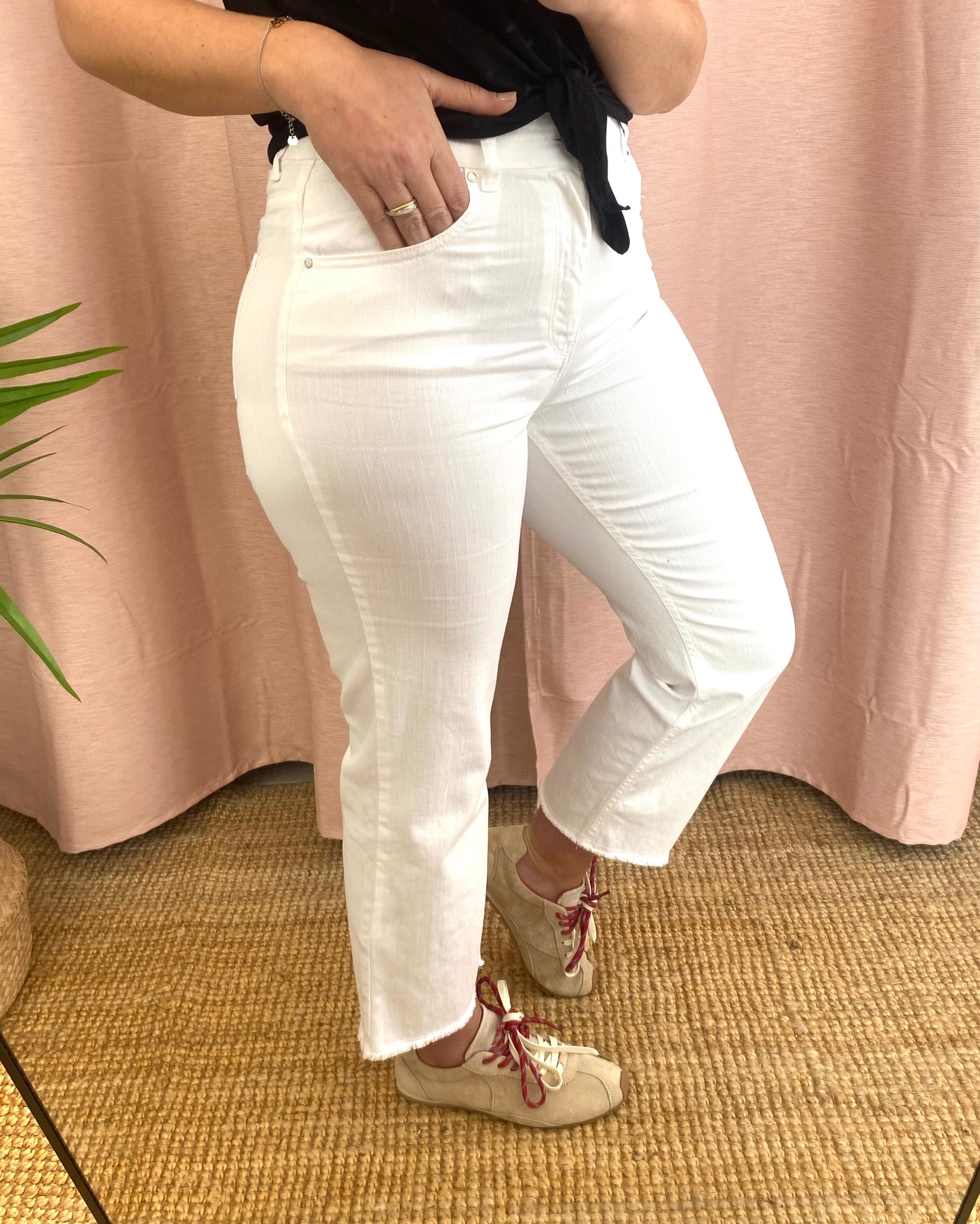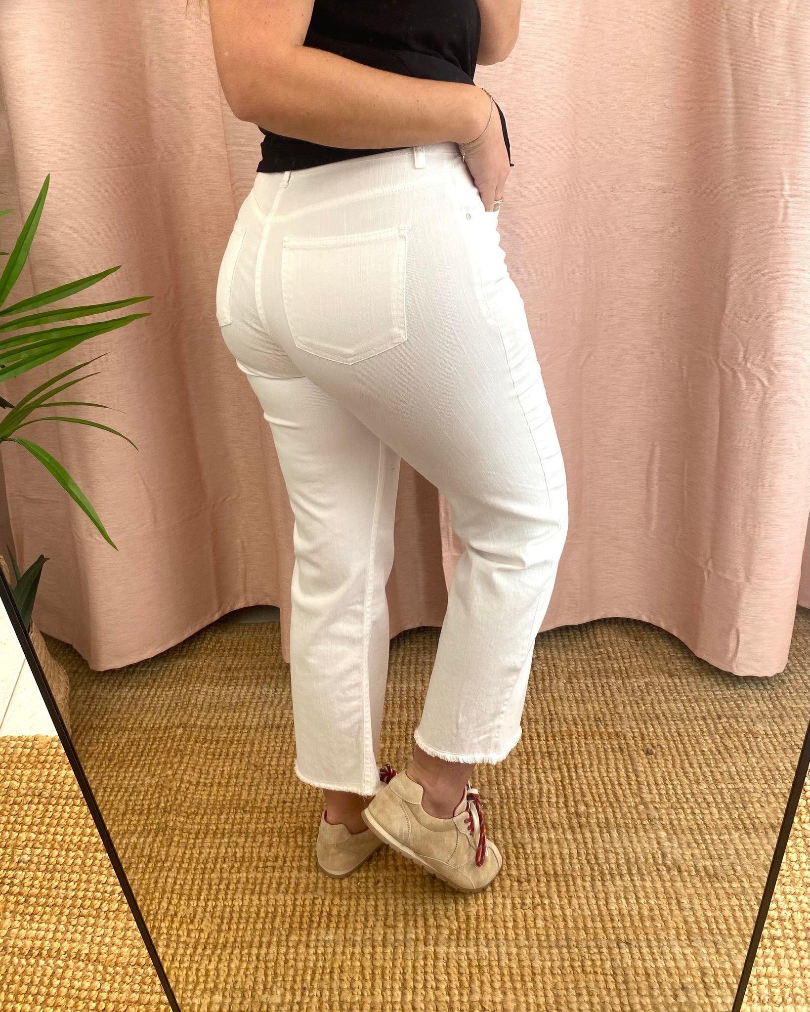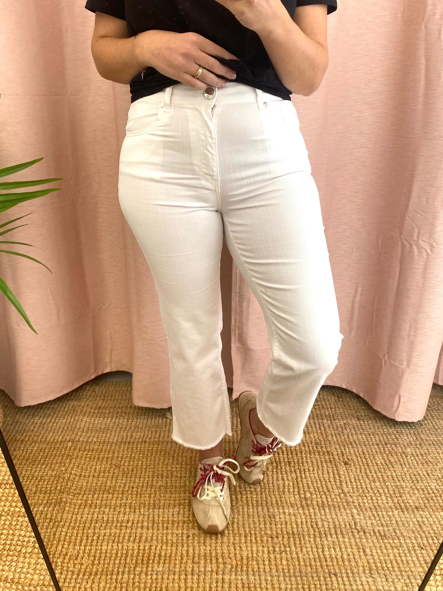 Calças de sarja brancas modelo cropped flare da Bigzone, composição; 98%algodão, 2%elastano