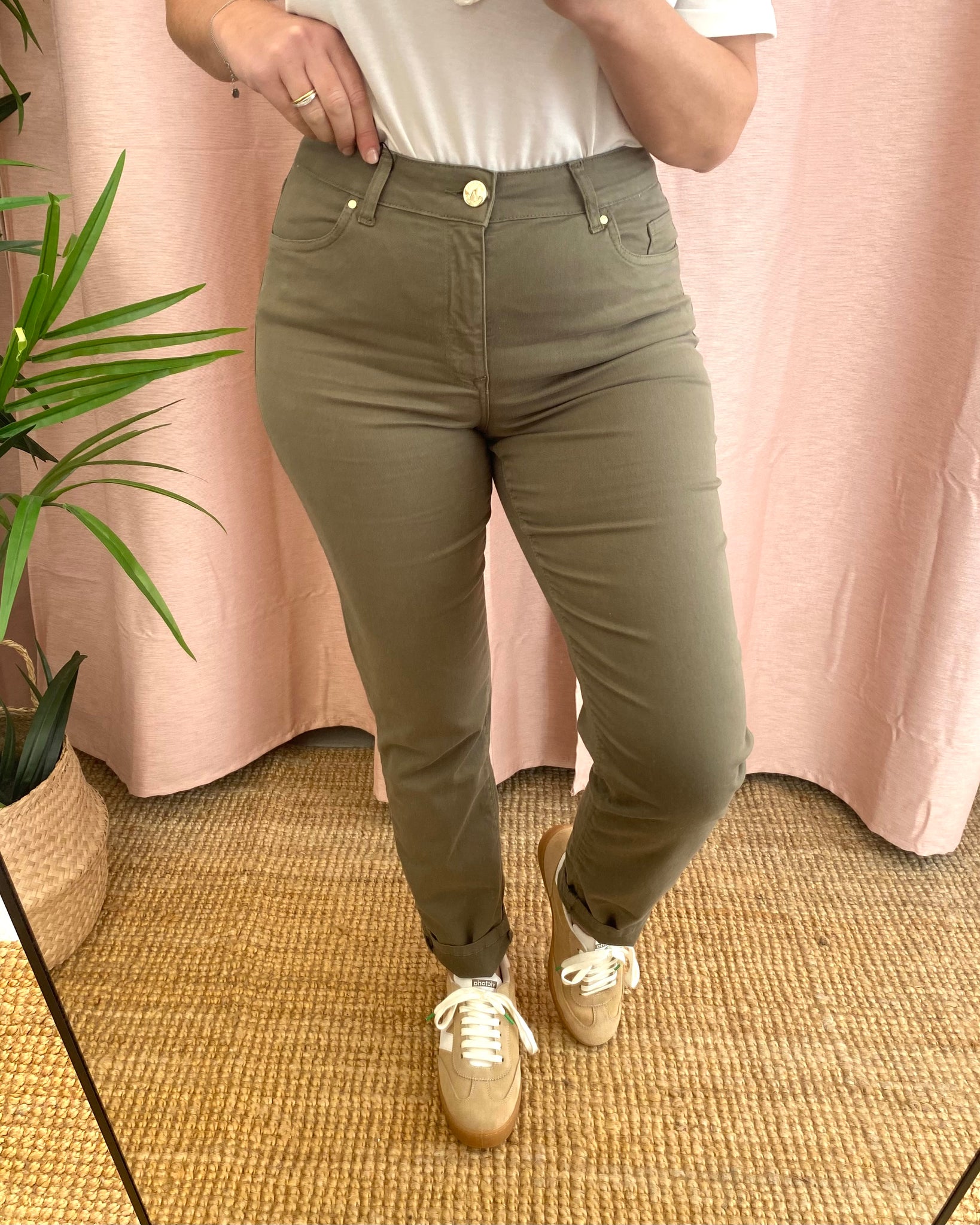 Calças de sarja verde seco do modelo Lady F , composição: 92%algodão 5%elastomuliester 3%elastano