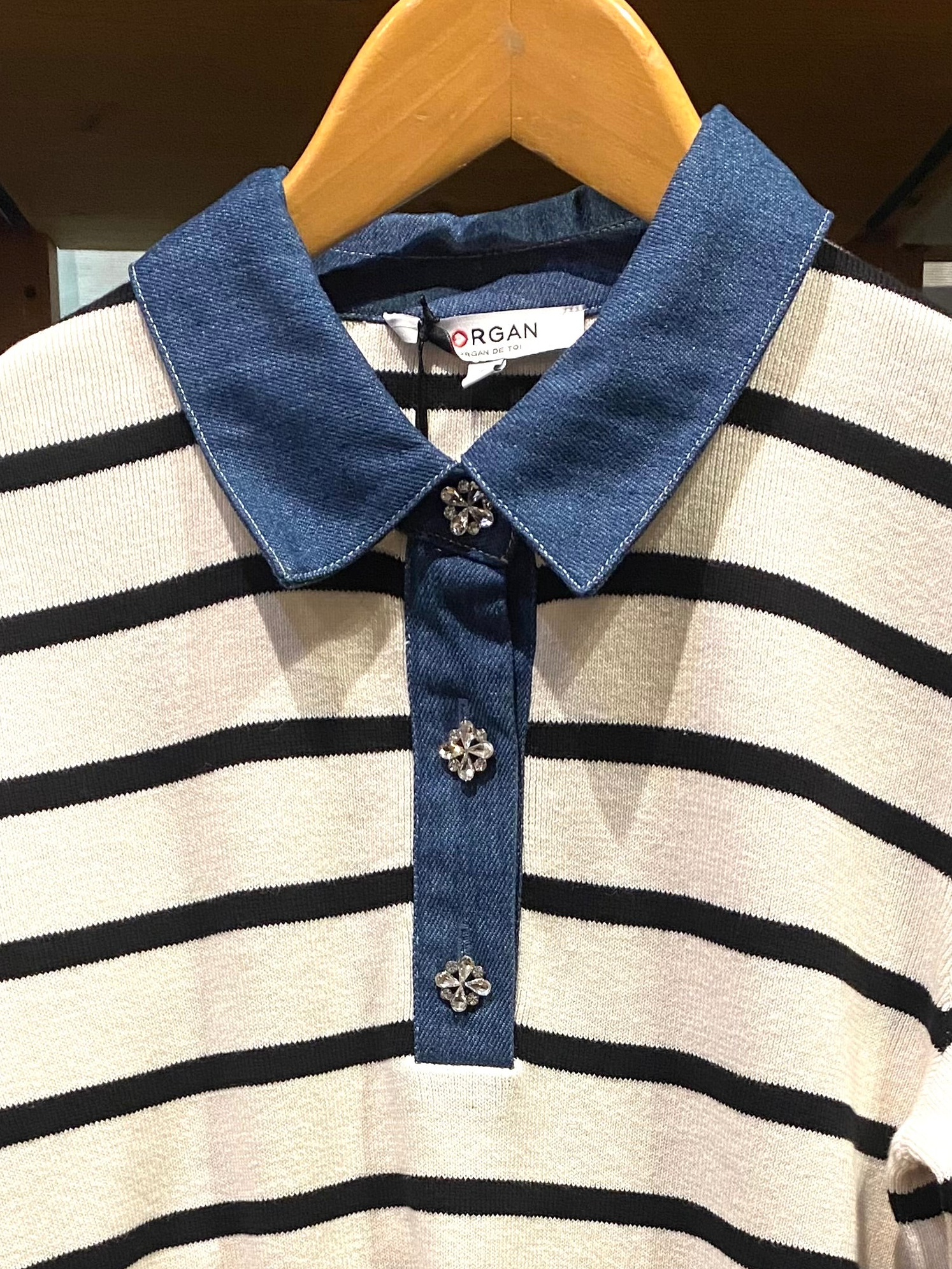 Polo de malha com riscas com detalhes em ganga da MORGAN , ref:mathis , composição: 20%POLYESTER 80%algodão ,entrega 1 a 2 dias úteis