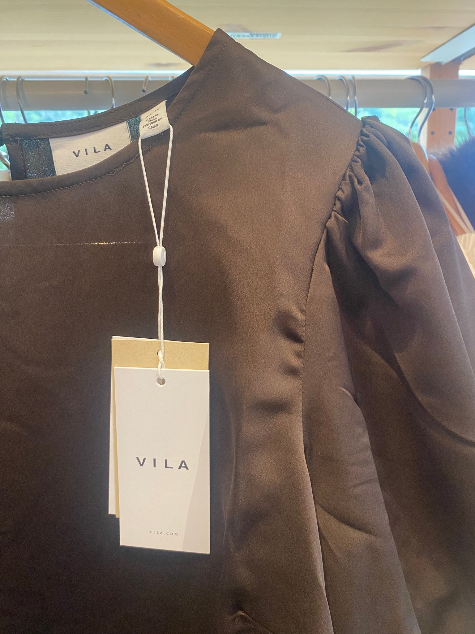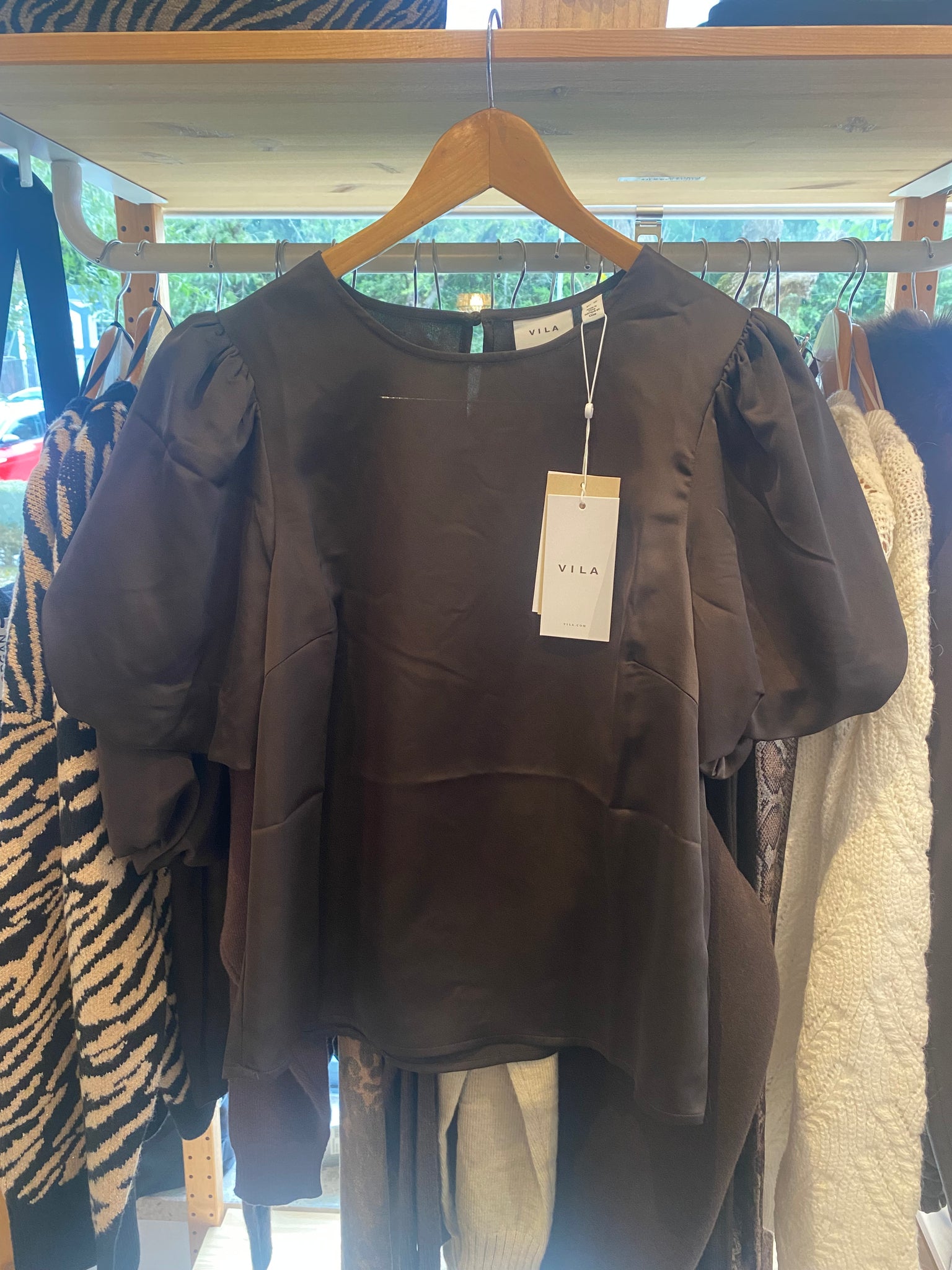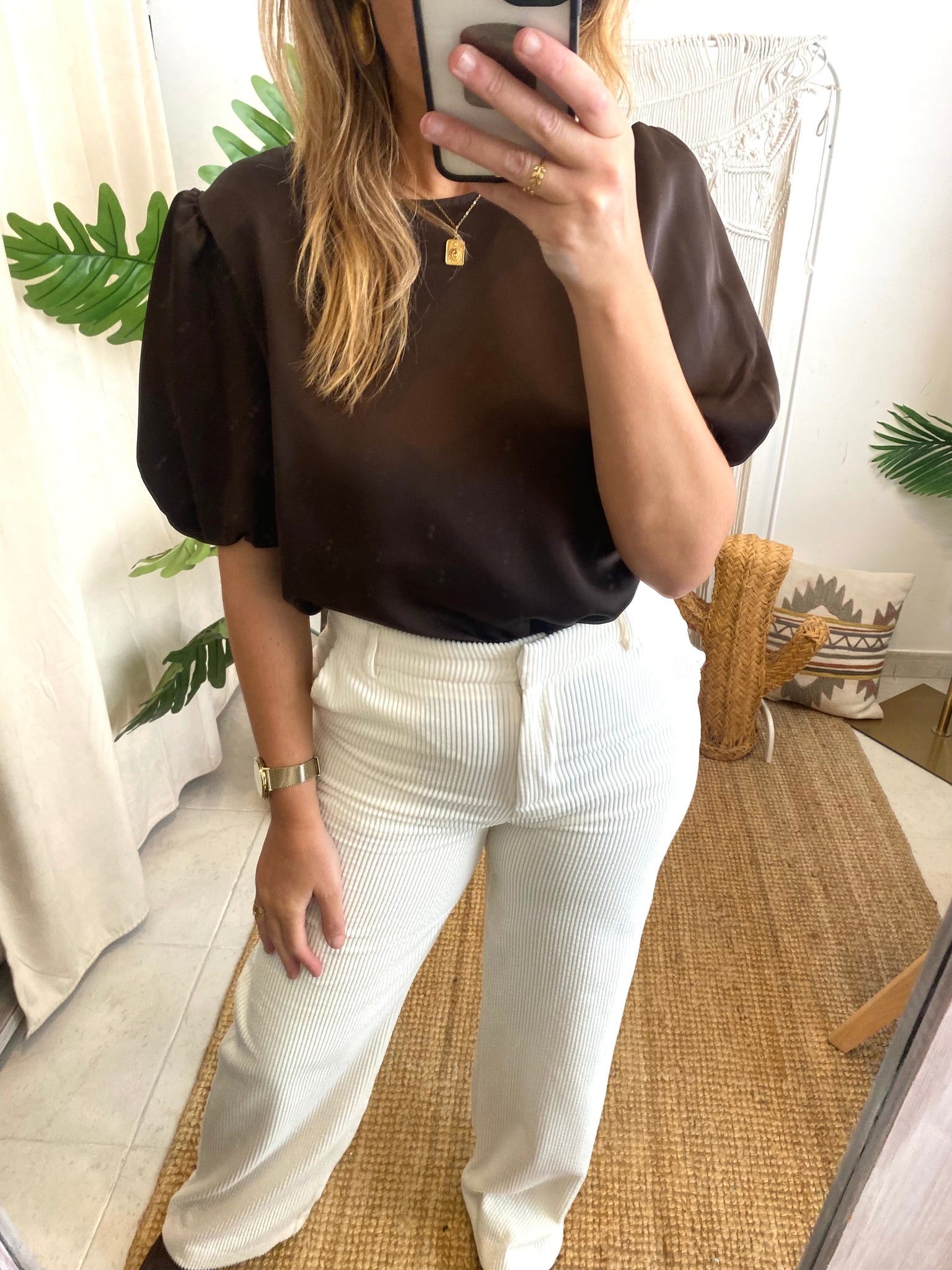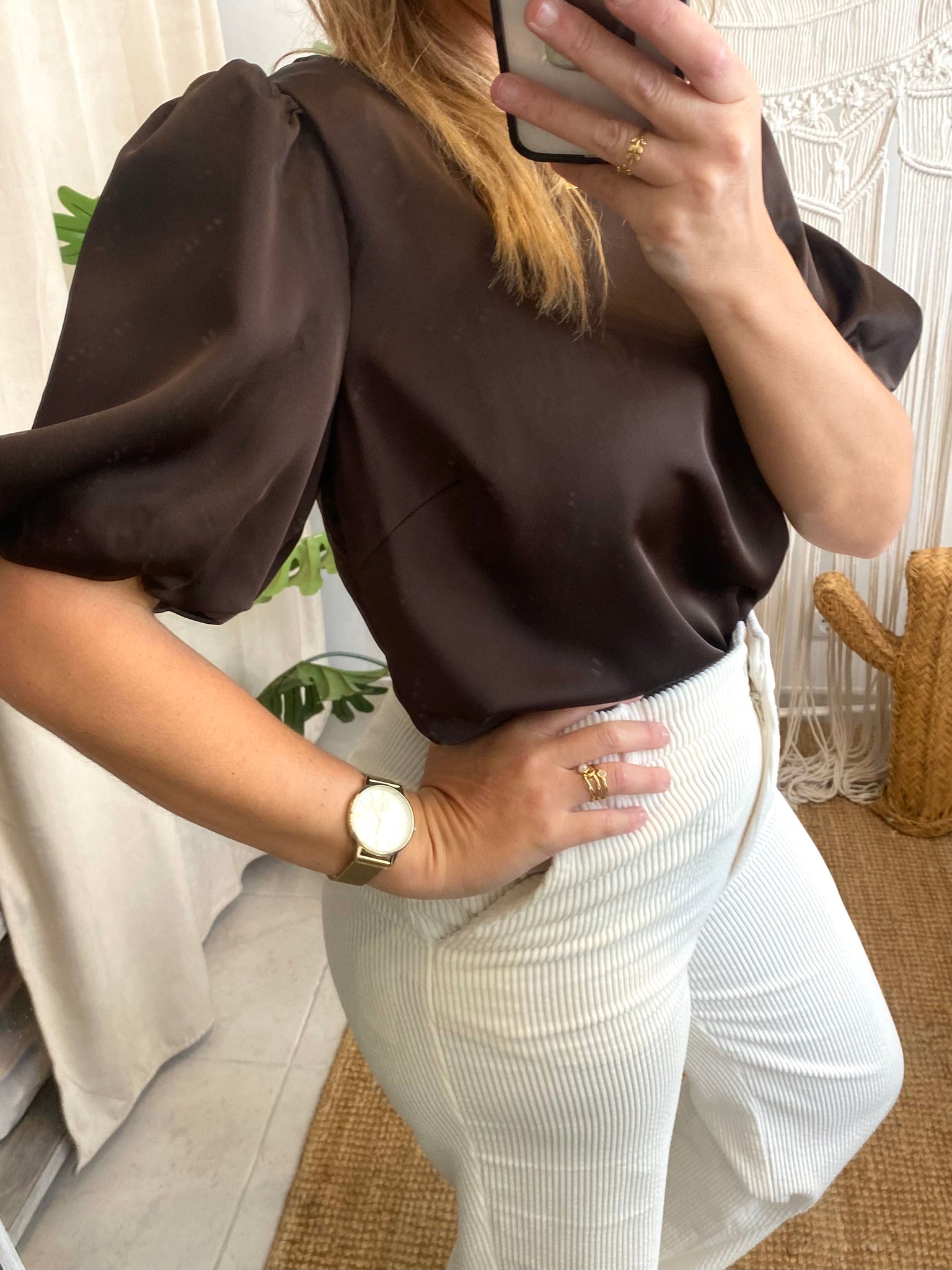Blusa acetinada manga balão castanho